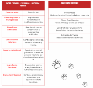 Harina de vísceras de pollo, arroz partido, maíz integral molido, aceite de pollo, glúten de maíz 60, salvado de trigo, salvado de arroz aceitoso, hidrolizado de hígado de pollo y cerdo, pulpa de remolacha, prebiótico (MOS), extracto de yucca, probiótico (Bacillus cereus y Bacillus subtilis), cloruro de sodio (sal común), semilla de linaza (mín 1%), zinc aminoácido quelatado, selenio aminoácido quelatado, manganeso aminoácido quelatado, aditivo fungicida (propionato de calcio), aditivo antioxidante (BHT/BHA), zeolita, hexametafosfato, premezcla de vitaminas mineral, cloruro de colina, sulfato de condroitina, sulfato de glucosamina y L-carnitina.