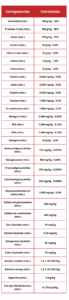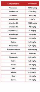 Harina de vÃsceras de pollo (mÃn. 44%), arroz partido, aceite de pollo (mÃn. 12%), almidón de yuca, harina de chicharrones de cerdo (mÃn. 5%), huevo en polvo (mÃn. 3%), hidrolizado de hÃgado de pollo (mÃn. 2%), salvado de alfalfa (mÃn. 2%), pulpa de remolacha (mÃn. 2%), harina de papa dulce (mÃn. 2%), semilla de linaza (mÃn. 1%), vegetales deshidratados (zanahoria, guisante, papa dulce, remolacha, perejil, espinaca, zapallo y apio) (mÃn. 1%), hidrolizado de hÃgado de pollo y cerdo (mÃn. 1%), biomasa de microalgas deshidratadas (Schizochytrium sp), proteÃna de zinc, levadura enriquecida con selenio, proteÃna de manganeso, vitaminas (A, D3, E, K3, B1, B2, B6, B12, K, ácido ascórbico, biotina, niacina, ácido fólico, ácido pantoténico, colina), minerales (sulfato de hierro, óxido de zinc, sulfato de manganeso, yodato de calcio, selenito de sodio), cloruro de potasio, cloruro de sodio (sal común), Extracto de yuca, levadura hidrolizada deshidratada, pared celular de levadura, plátano deshidratado (mÃn. 0,3%), manzana deshidratada (mÃn. 0,3%), cloruro de colina, pared celular de levadura, fructooligosacáridos, galactooligosacáridos, levadura de caña de azúcar deshidratada (Prebiótico), DL-Metionina, antimicrobiano (propionato de calcio), antioxidante natural (extracto de romero, extracto de té verde y extracto de menta), taurina, extracto de arándano (Vaccinium myrtillus) (mÃn. 0,075%), sulfato de glucosamina, sulfato de condroitina, hexametafosfato de sodio, Probiótico (Bacillus cereus y Bacillus Subtilis), carbonato de calcio y proteÃnato de cobre.