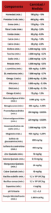 sulfato de glucosamine, DL-metionina, sulfato de condroitina, L-carnitina, hexametafosfato de sodio, probiótico (Bacillus cereus y Bacillus subtilis) y proteinato de cobre.