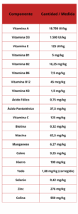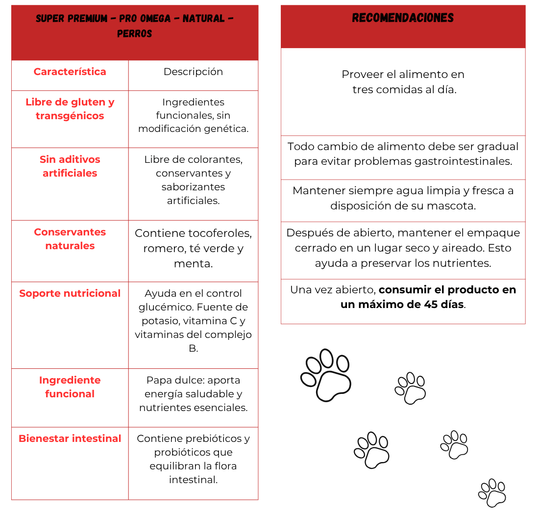 Harina de vÃsceras de pollo (mÃn. 50%), arroz partido (mÃn. 9%), almidón de yuca, harina de chicharrones de cerdo (mÃn. 5%), harina de salmón (mÃn. 5%), huevo en polvo (mÃn. 3%), hidrolizado de pollo, hÃgado de pollo y cerdo (mÃn. 3%), pulpa de remolacha (mÃn. 2%), harina de papa dulce, cloruro de sodio (sal común), aceite de pescado (mÃn. 1,5%), semilla de linaza (mÃn. 1%), aceite de pollo (mÃn. 1%), alfafa deshidratada (mÃn. 1%), zeólita, ácido fosfórico, biomasa de microalgas deshidratadas (Schizochytrium sp.) (mÃn. 0,56%), proteinato de zinc, proteinato de manganeso, levadura enriquecida con selenio, vitaminas (A, D3, E, B1, B2, B6, B12, K, niacina, ácido fólico, ácido pantoténico, colina), minerales (sulfato de hierro, óxido de zinc, sulfato de cobre, óxido de manganeso, yodato de calcio, selenito de sódio), cloruro de potasio, levadura de cerveza inactivada deshidratada, extracto de yucca, prebiótico (Mananooligosacáridos – MOS), plátano deshidratado (mÃn. 0,3%), guisante deshidratado (mÃn. 0,3%), manzana deshidratada (mÃn. 0,3%), cloruro de colina, vegetales deshidratados (zanahoria, remolacha, espinaca, apio, perejil, lechuga y berro) (mÃn. 1%), prebióticos (Galactooligosacáridos – GOS y Fructooligosacáridos – FOS), semilla de psyllium, fibra de guisante, antifúngico (propionato de calcio), antioxidante natural (concentrado de tocoferoles, extracto de romero, extracto de té verde y extracto de menta) (mÃn. 0,15%), L-taurina, L-lisina, celulosa en polvo, arándano deshidratado (mÃn. 0,075%),